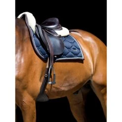 Elegant saddle pad with a gathered edge and a silky appearance. With the aid of the stop cushion and the straightforward or subdivided girth strap loop, saddle slippage is avoided. Comfort is enhanced by the bamboo lining’s ability to absorb sweat.